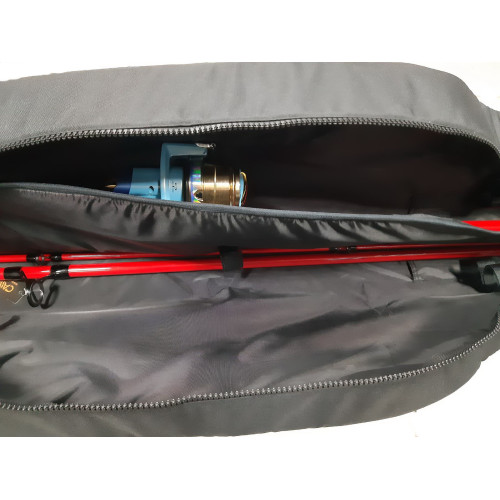Помещается до 4 морских удилищ с катушками. Размеры: 16см х 27 см (в широкой части) х 165 см.