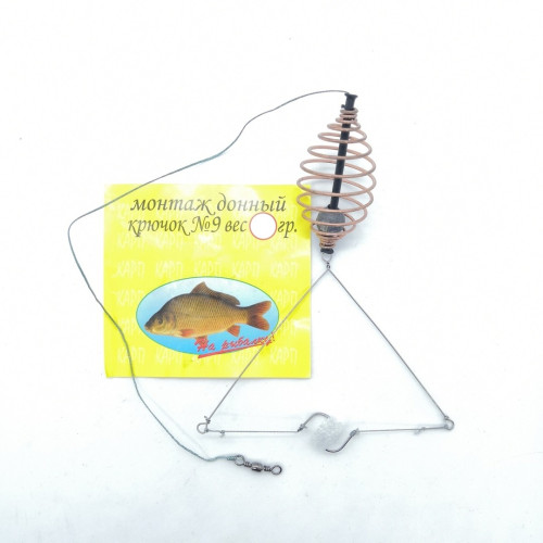 Готовый донный монтаж с кормушкой пружина 2 крючка - конструкция состоит из кормушки в виде пружины и двух крючков на коромысле. Крепёж всех частей защищён кембриками. Для закрепления на основную леску должен использоваться карабин. Можно довольно просто менять дополнительное приспособление для заготовок. Пружинное исполнение надёжно удерживает прикормку во время заброса. Комплект представлен в разном весе.