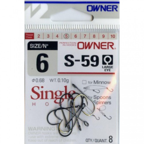 Серию крючков OWNER S-59 рекомендуется использовать при оснащении блесен и различных типов воблеров, в том числе и минноу. Крючки характеризуются удлиненным цевьем, полукруглым загибом и удлиненным жалом. Данная серия крючков часто используются в дорогих японских воблерах и блеснах, легкого и ультра-легкого класса. Главное их отличие от обычных одинарных крючков – это большое широкое ушко для крепления к приманке через заводное кольцо.
