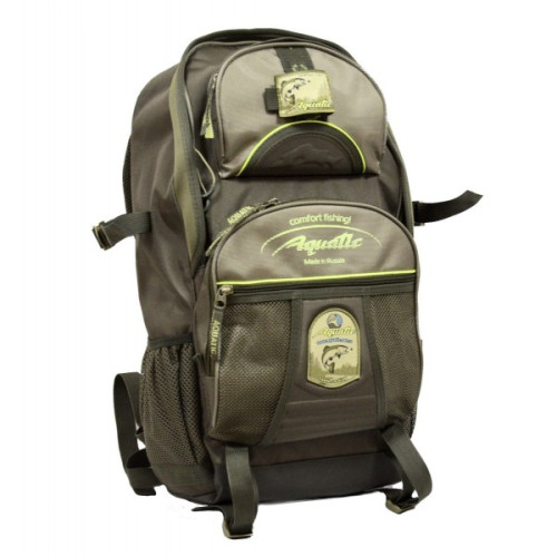 Самый популярный у рыбаков рюкзак Aquatic объёмом около 40 литров изготавливается из качественных непромокаемых материалов. Состоит из основного отделения, защищенного от влаги неопреновой лентой и 5 наружних карманов- разной функциональности. На рюкзаке возможно закрепить габаритные вещи: тубус, туристический коврик, телые вещи и т.д.